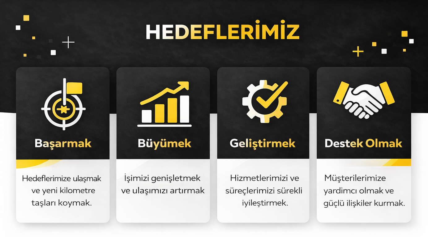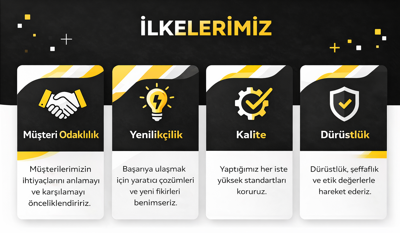 Güven, şeffaflık ve kalite bizim temel değerlerimizdir. Her projeye aynı özenle yaklaşır, iş ortaklarımızla uzun vadeli ve sağlam ilişkiler kurmayı hedefleriz.